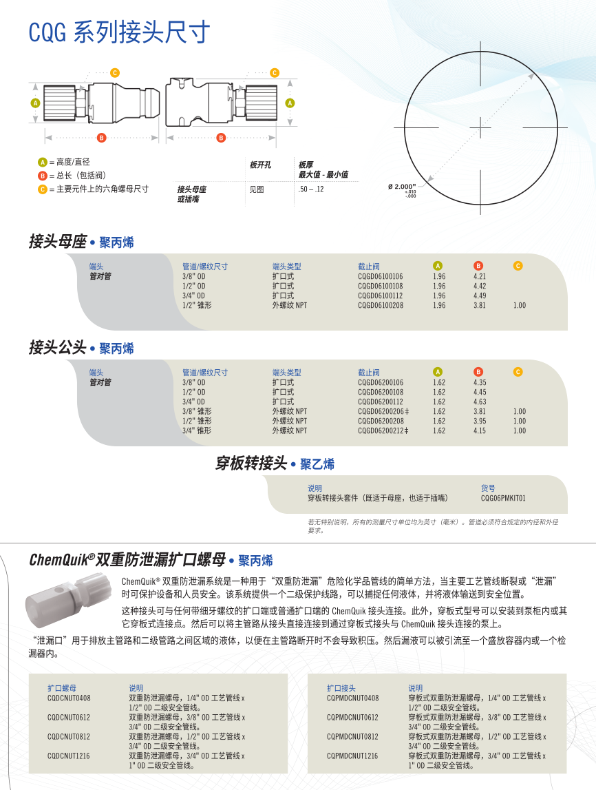 CQG Series high purity couplings feature our patented pressure-balanced, non-spill design. Molded virgin polypropylene and a 100% springless flow path provide broad chemical resistance and exceptionally high flow capacity, allowing instant disconnects (and reconnects), even under pressure.