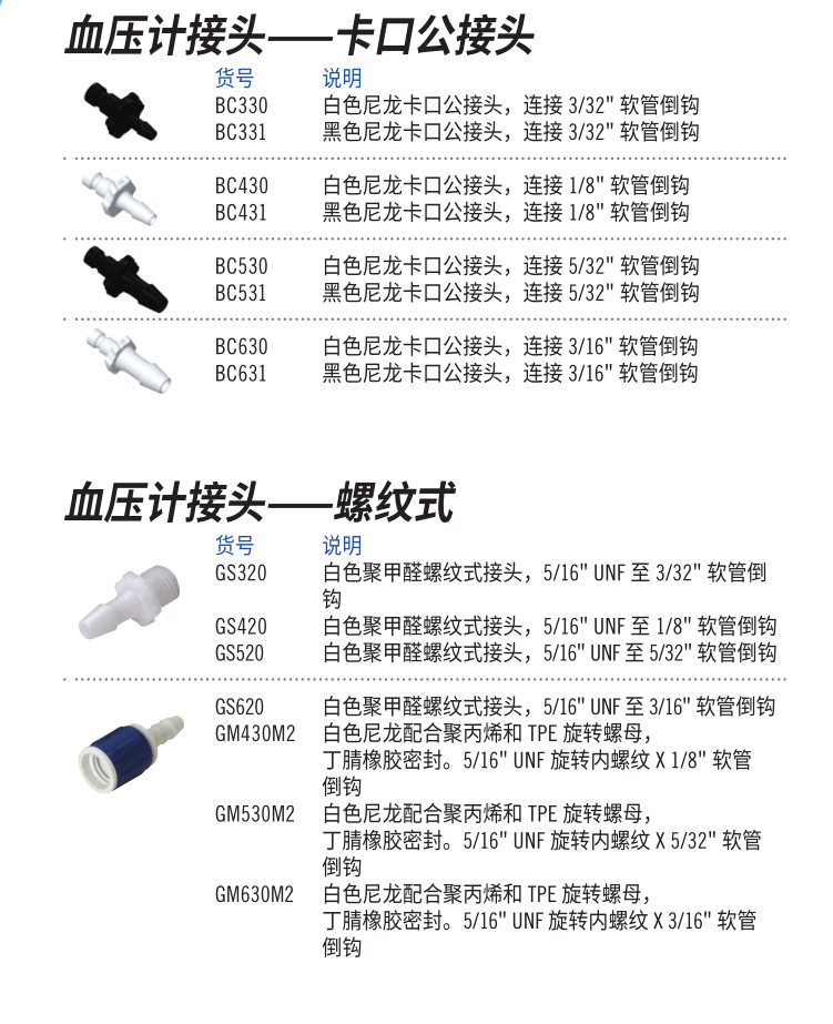 采用CPC的普通接頭、魯爾接頭與血壓計用連接器,以確保每一次精準的連接。 我們的血壓計用連接器采用精密軟管倒鉤和螺紋形式。不管您需要是什么類型的連接器 - 卡口式組裝件、SMC、直彎、螺紋和多管道連接器 ,我們均可以提供血壓計袖帶使用的無泄漏解決方案。對于有限度或一次使用的要求,則不需要截止閥, 那么高品質、精密成型以及低流量的魯爾連接器便是你的首選。
